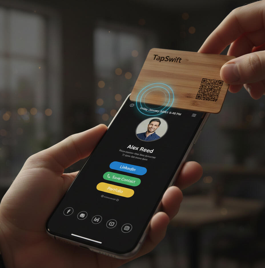 Our StoryTapSwift is a Dubai-based tech brand redefining how professionals and businesses connect in the digital age. We specialize in premium NFC (Near Field Communication) solutions that bridge the gap between physical interactions and instant digital results.From our flagship Smart Business Cards to our high-conversion Google Review Cards, we help you eliminate paper waste and maximize every handshake. Whether you’re a solo entrepreneur or a large-scale facility, TapSwift provides the tools to share your contact info, portfolio, or review links in a single, seamless tap.Our MissionTapSwift is a premier provider of smart networking and reputation-building solutions. We specialize in high-performance NFC (Near Field Communication) technology designed to streamline how professionals connect and how businesses grow.By replacing traditional paper products with sleek, durable, and eco-friendly smart cards, we empower our clients to share their digital world in a single tap.